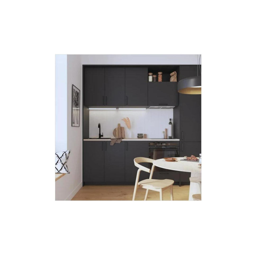 Σύνθεση κουζίνας Delinia ID στα μέτρα σου Vienne με προσόψεις από μοριοσανίδα με επένδυση PET σε χρώμα μαύρο με ματ φινίρισμα. Τα έπιπλα κουζίνας Delinia ID είναι προϊόντα υψηλών προδιαγραφών και ποιότητας, συνδυάζουν καλαισθησία και πρακτικότητα και προσαρμόζονται στα μέτρα σου δίνοντας σου τη δυνατότητα να φτιάξεις μια κουζίνα προσαρμοσμένη στις προσωπικές σου ανάγκες. Επιλέγοντας ανάμεσα από μια ευρεία γκάμα σχεδίων, διάφορα ύψη και μήκη ντουλαπιών, 19 διαφορετικών προσόψεων και μηχανισμούς soft-closing στις πόρτες και στα συρτάρια μπορείς να αποκτήσεις την κουζίνα της ζωής σου προσαρμοσμένη στον τρόπο ζωής σου, στο χώρο σου, στο στυλ σου και σε σένα. Η τιμή που αναγράφεται είναι ενδεικτική για κουζίνα συνολικού μήκους 225 cm και δεν περιλαμβάνει τις ηλεκτρικές συσκευές, τον πάγκο, τα αξεσουάρ πάγκου, τον νεροχύτη, την μπαταρία κουζίνας, τα λοιπά υδραυλικά στοιχεία και τα χερούλια. Κατασκευάζεται στην Ιταλία και έχει 25 χρόνια εγγύηση. Κλείσε τώρα ραντεβού με τον προσωπικό σου σύμβουλο κουζίνας και σχεδιάστε μαζί την κουζίνα των ονείρων σου στα μέτρα σου και στην τιμή που επιθυμείς.