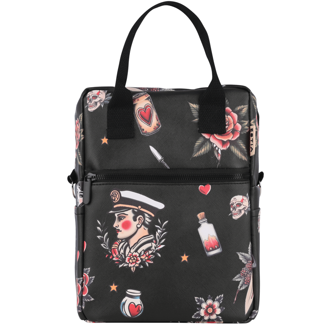 Ισοθερμική τσάντα φαγητού ανθρακί με φόντο κόκκινες λεπτομέρειες και old-school σχέδιο. Η εξωτερική επιφάνεια της τσάντας είναι κατασκευασμένη από PVC leather ένα ανθεκτικό συνθετικό υλικό που προσφέρει κομψή εμφάνιση και μεγάλη διάρκεια ζωής. Το υφασμα αυτό προσομοιώνει την εμφάνιση και υφή του φυσικού δέρματος αλλά είναι κατασκευασμένο από PVC ένα είδος πλαστικού. Εσωτερικά έχει ισοθερμική επένδυση που διατηρεί την θερμοκρασία του φαγητού ή του ποτού σου για περισσότερη ώρα. Διαθέτει 2 θέσεις για μπουκάλια μία στην κύρια θήκη και μία εξωτερικά για να μένει το περιεχόμενο του μπουκαλιού σου στην κατάλληλη θερμοκρασία. Κλείνει με φερμουάρ και μεταφέρεται εύκολα χάρη στις πρακτικές λαβές της. Με εξωτερική θήκη που κλείνει με φερμουάρ για να μπορείς να τοποθετείς τα κλειδιά το κινητό ή ότι άλλο χρειάζεσαι.