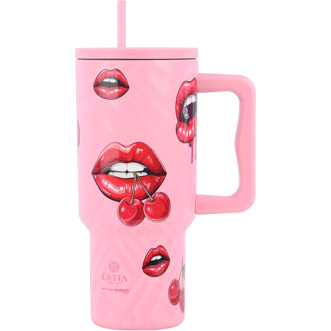 Θερμός ποτήρι XL ροζ με λαβή και καλαμάκι 900ml
