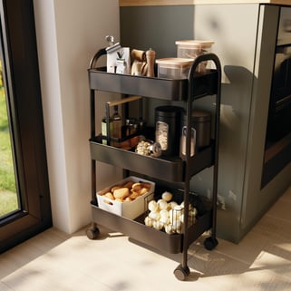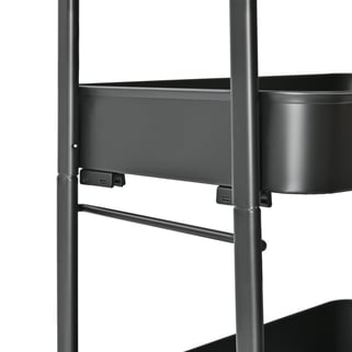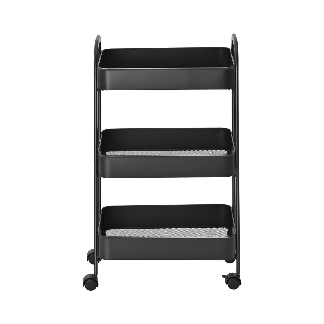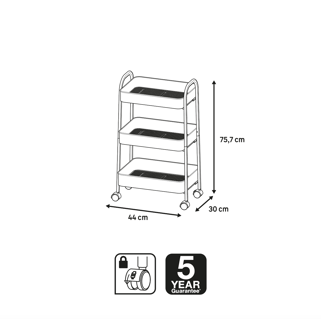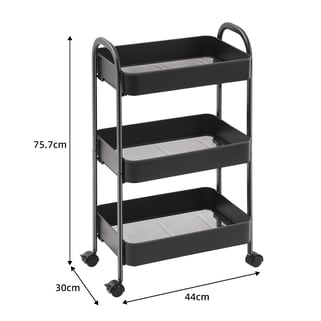 Τρόλεϊ κουζίνας από μέταλλο σε μαύρη απόχρωση με 3 ράφια. Τοποθετείται και μετακινείται εύκολα με ροδάκια σε όποιο σημείο της κουζίνας επιθυμείς ανάλογα τις ανάγκες σου, παρέχοντάς σου άμεση πρόσβαση σε μπουκάλια, μπαχαρικά, φρούτα ή οποιαδήποτε άλλο προιόν επιλέξεις. Στη Leroy Merlin θα βρεις μεγάλη ποικιλία σε επιδαπέδια αξεσουάρ που ταιριάζουν σε κάθε κουζίνα και στυλ διακόσμησης.