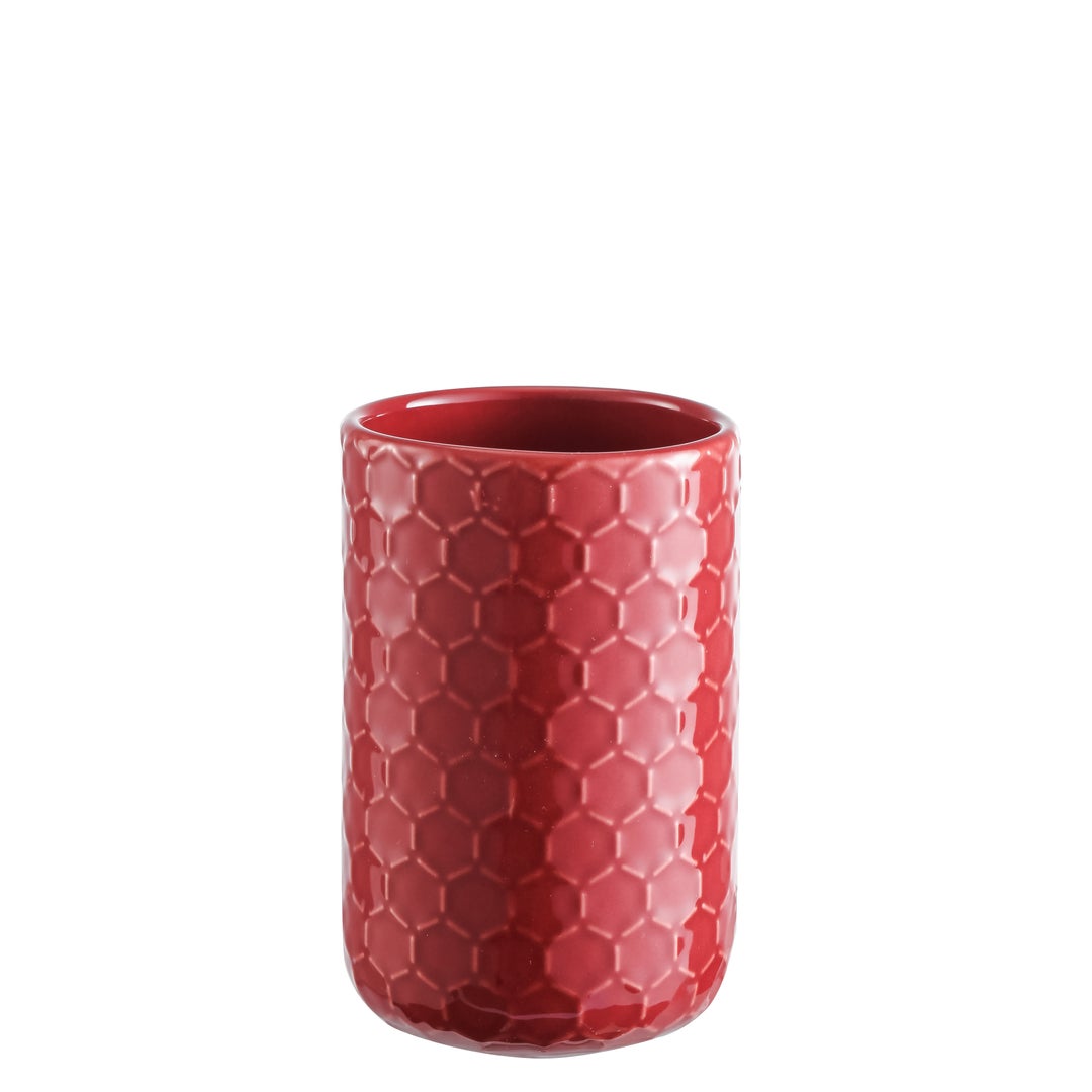 Ποτηροθήκη μπάνιου Glamour σε κόκκινη απόχρωση με ανάγλυφη υφή. Τοποθετείται ελεύθερα στο έπιπλο μπάνιου, σε όποιο σημείο δίπλα στον νιπτήρα επιθυμείς παρέχοντάς σου άμεση πρόσβαση στην οδοντόβουρτσα και οδοντόκρεμα κατά την ώρα που πλένεις τα δόντια σου. Στην ίδια σειρά μπορείς να βρεις ντισπένσερ και δίσκο για να ολοκληρώσεις την λειτουργικότητα και την διακόσμηση του χώρου σου.
