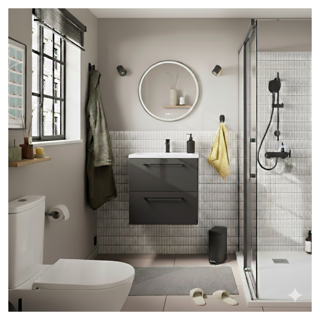 Έπιπλο μπάνιου Remix κρεμαστό από μοριοσανίδα σε μαύρη ματ απόχρωση. Διαθέτει 2 συρτάρια που προσφέρουν τον απαραίτητο αποθηκευτικό χώρο για να οργανώσεις όλα τα απαραίτητα αντικείμενά σου και εναν κεραμικό νιπτήρα σε λευκή απόχρωση μήκους 61cm. Ο μηχανισμός soft close των συρταριών επίπλου βοηθά να κλείνουν αργά και αθόρυβα παρέχοντας επιπλέον ευκολία στην χρήση τους. Η συγκεκριμένη σύνθεση επίπλου περιλαμβάνει στην τιμή της την βάση επίπλου και τον νιπτήρα. Η Leroy Merlin σου δίνει τη δυνατότητα να συνδυάσεις την επιλογή σου με επιπλέον προιόντα όπως μπαταρία, καθρέπτη, ντουλάπι μπάνιου ή μια στήλη μπάνιου που θα ικανοποιήσει την ανάγκη σου για επιπλέον αποθήκευση και οργάνωση δίνοντας ένα ολοκληρωμένο αποτέλεσμα στο χώρο.