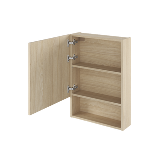Καθρέπτης ντουλάπι σε απόχρωση ανοιχτής δρυός από μοριοσανίδα επενδεδυμένη με μελαμίνη. Διαθέτει συνολικά 3 ράφια παρέχοντάς σου επιπλέον χώρο αποθήκευσης. Τα 2 ράφια του "κρύβονται" πίσω από τον καθρέπτη, στο ανοιγόμενο ντουλάπι όπου δεν είναι ορατά τα προϊόντα που έχεις μέσα και το 3ο ράφι του "γυμνό" κάτω από τον καθρέπτη για προϊόντα που δεν έχεις πρόβλημα να είναι εκτεθειμένα. Είναι η ιδανική λύση για ένα μπάνιο αφου σου καλύπτει τις χρηστικές ανάγκες προσφέροντας άμεση πρόσβαση στα προσωπικά σου αντικείμενα και παράλληλα σου καλύπτει τις αισθητικές ανάγκες έχοντας εναν καθρέπτη και δίνοντας την ψευδαίσθηση ενός μεγαλύτερου μπάνιου.