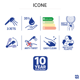 Σετ τηλέφωνο ντους με σπιράλ και βέργα Sensea Icone σε μαύρη γυαλιστερή απόχρωση. Διαθέτει 3 εξόδους νερού, με αντιστρεπτικό σπιράλ μήκους 150cm από PVC, στρογγυλή κεφαλή με διάμετρο 110mm και βέργα με στήριγμα ντους χειρός ρυθμιζόμενο κατά μήκος της ράβδου χάρη στο εργονομικό του σύστημα. Σου προσφέρει εξοικονόμηση νερού έως 35% και διαθέτει σύστημα αποφυγής αλάτων μαζί με το σύστημα Easy Clean για εύκολο καθαρισμό και αφαίρεση αλάτων από το τηλέφωνο. Με το κατάλληλο τηλέφωνο ντους μαζί με το σπιράλ του μπορείς να πολλαπλασιάσεις τα οφέλη που μπορεί να σου προσφέρει ένα ντους και να απολαύσεις το πιο χαλαρωτικό μπάνιο με την σωστή ροή νερού και το απαραίτητο μήκος του σπιράλ. Προσφέρει την ιδανική λύση συνδυάζοντας άψογα την αισθητική και την ποιότητα καθώς είναι κομψό και εύκολο στην χρήση και στην εγκατάσταση. Στην Leroy Merlin θα βρεις μεγάλη ποικιλία σε σετ τηλεφώνου με σπιράλ και βέργα που μπορούν να καλύψουν τα γούστα και τις ανάγκες σου.