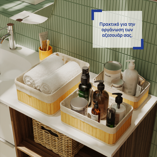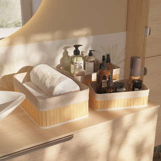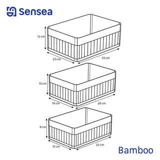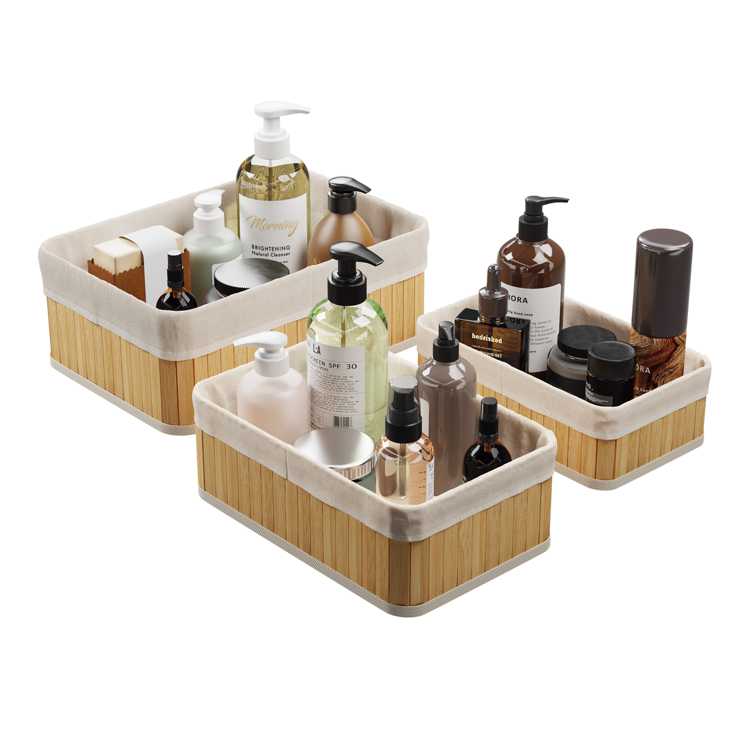 Σετ καλάθια τακτοποίησης από bamboo στην φυσική της απόχρωση και εσωτερικά με αποσπώμενο πλενόμενο ύφασμα. Αποτελείται από 3 καλάθια κατάλληλα για την οργάνωση και τακτοποίηση όλων των αντικειμένων στο μπάνιο σου. Χάρη στα τρία διαφορετικά μεγέθη του, αυτό το σετ είναι ιδανικό για να οργανώσεις όπως θέλεις τα καθημερινά σου προϊόντα μπάνιου, μικρές πετσέτες, προϊόντα μακιγιάζ, βούρτσες και ότι επιθυμείς.