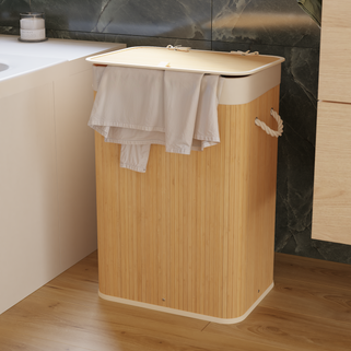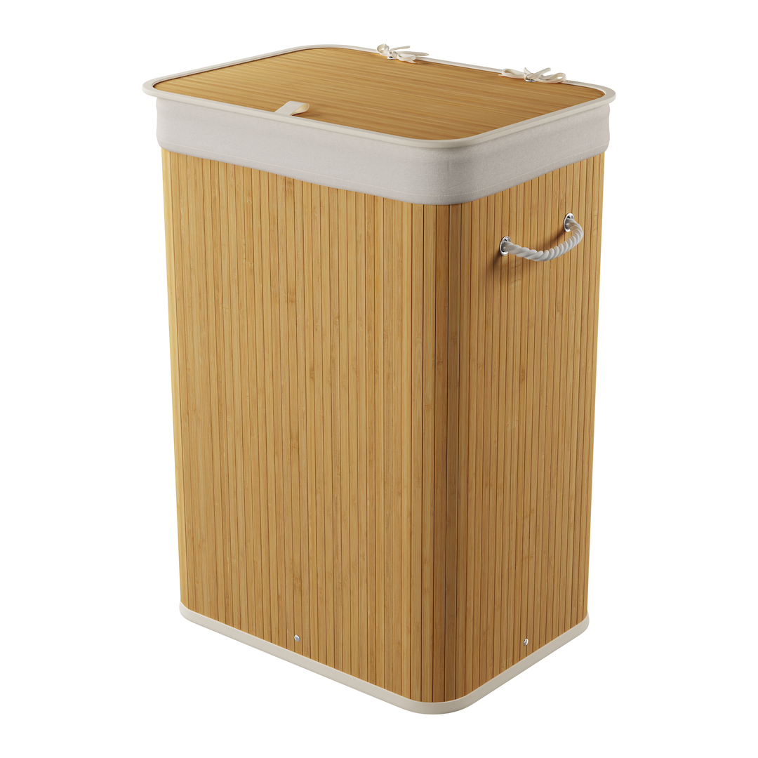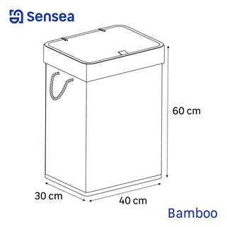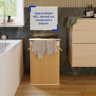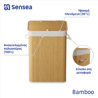 Καλάθι απλύτων Bamboo σε φυσικό χρώμα bamboo σκελετό με διαστάσεις Π40xΒ30xΥ60cm. Είναι κατασκευασμένο από ανακυκλωμένο πολυεστέρα που είναι ανθεκτικός στη βρωμιά και εύκολος στη συντήρηση. Διαθέτει καπάκι στο πάνω μέρος του καλαθιού για την προστασία από ενδεχόμενη πτώση των άπλυτων ρούχων σε περίπτωση μετακίνησης και εσωτερικά έχει μια αφαιρούμενη θήκη για εύκολο καθαρισμό. Αποτελεί μια πρακτική και χρήσιμη λύση για να τακτοποιήσεις και παράλληλα να διακοσμήσεις τον χώρο του μπάνιου σου εύκολα και οικονομικά.