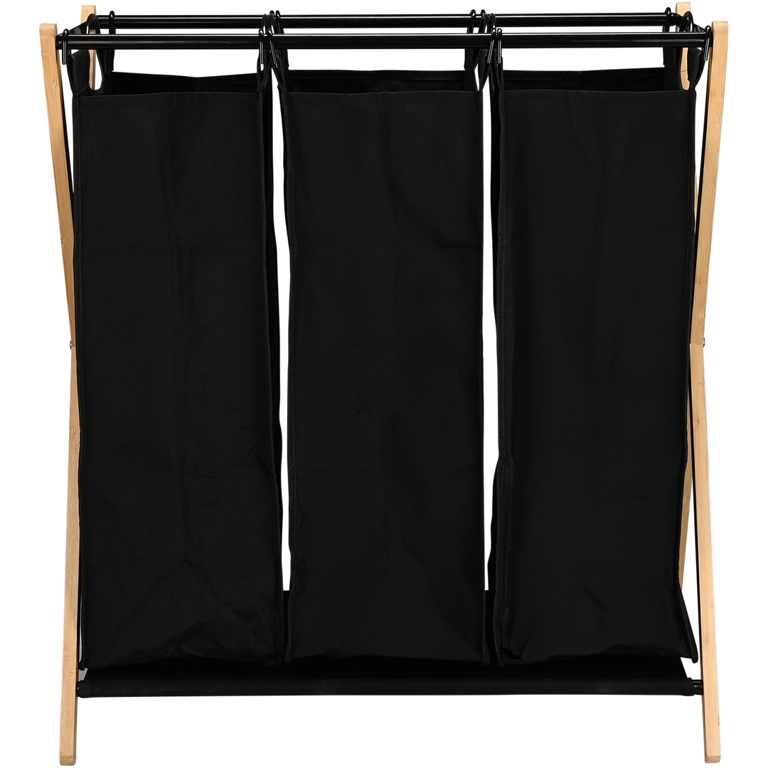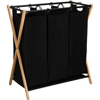 Καλάθι απλύτων με 3 ξεχωριστούς σάκους για τον διαχωρισμό των ρούχων σε λευκά, σκούρα και χρωματιστά με διαστάσεις Π76xΒ68xΥ40cm. Το συγκεκριμένο καλάθι απλύτων βοηθά στην διαδικασία του πλυσίματος καθιστώντας την πιο εύκολη. Είναι κατασκευασμένο από μέταλλο και bamboo που είναι ανθεκτικό στη βρωμιά και εύκολο στη συντήρηση. Διαθέτει χερούλια σε περίπτωση που επιθυμείς να το ανασηκώσεις και να το μετακινήσεις. Αποτελεί μια πρακτική και χρήσιμη λύση για να τακτοποιήσεις και παράλληλα να διακοσμήσεις τον χώρο του μπάνιου σου εύκολα και οικονομικά.