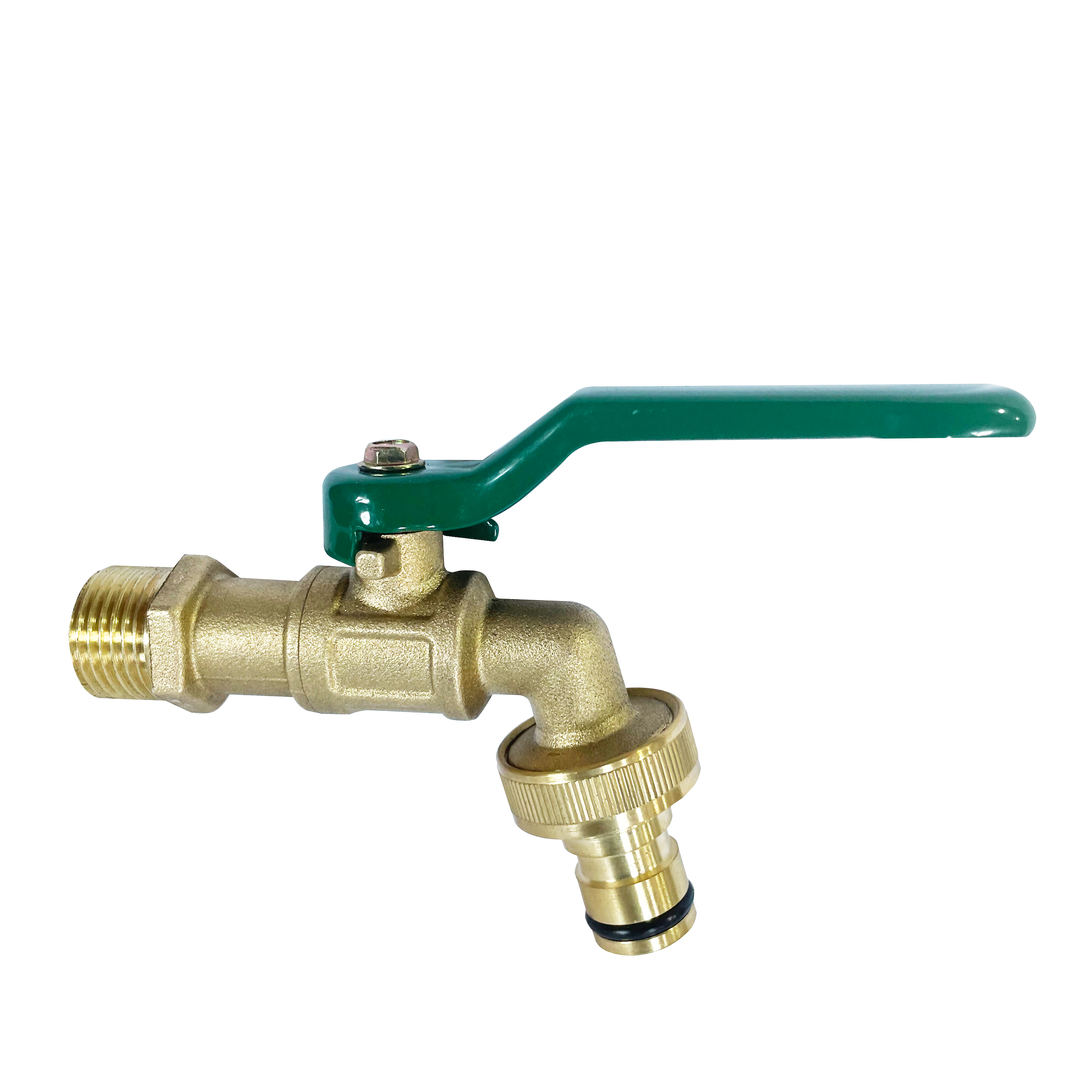 Διπλή βρύση με δύο εξόδους και σύνδεση 1/2'' Α, από ορειχάλκο, ιδανική για χρήση σε κήπους ή περιοχές με απαιτήσεις σε νερό.